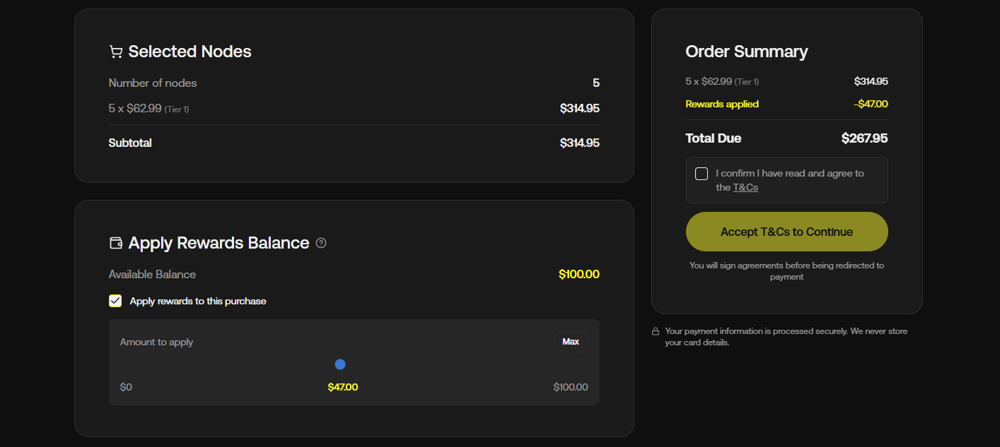 - Now you’re on the checkout page. If you have earned rewards from your existing AirNodes, you will be able to apply them toward your new purchase